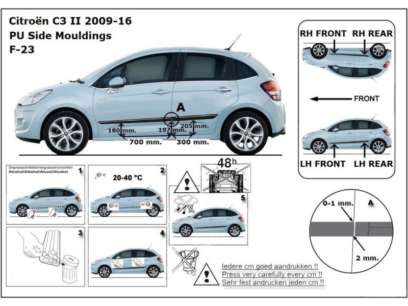 Ochranné lišty jsou vyráběny přesně na konkrétní model vozu, takže budou přesně pasovat na Váš vůz! Jejich montáž je velice snadná pomocí silně lepící pásky 3M, které je včetně odmašťovacích hadříků součástí balení. Návod na montáž.