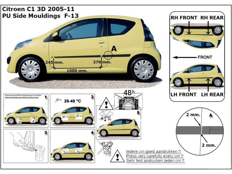 Ochranné lišty jsou vyráběny přesně na konkrétní model vozu, takže budou přesně pasovat na Váš vůz! Jejich montáž je velice snadná pomocí silně lepící pásky 3M, které je včetně odmašťovacích hadříků součástí balení. Návod na montáž.