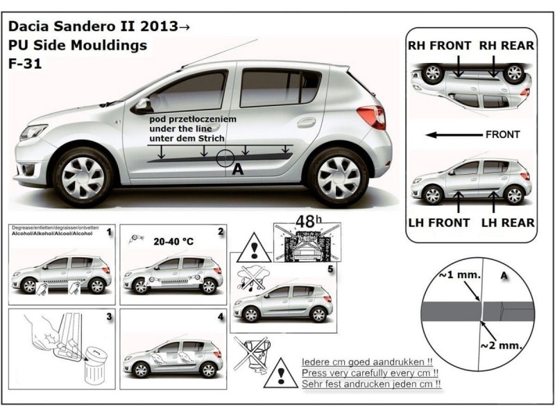 Ochranné lišty jsou vyráběny přesně na konkrétní model vozu, takže budou přesně pasovat na Váš vůz! Jejich montáž je velice snadná pomocí silně lepící pásky 3M, které je včetně odmašťovacích hadříků součástí balení. Návod na montáž.