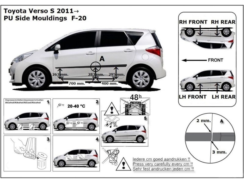 Ochranné lišty jsou vyráběny přesně na konkrétní model vozu, takže budou přesně pasovat na Váš vůz! Jejich montáž je velice snadná pomocí silně lepící pásky 3M, které je včetně odmašťovacích hadříků součástí balení. Návod na montáž.