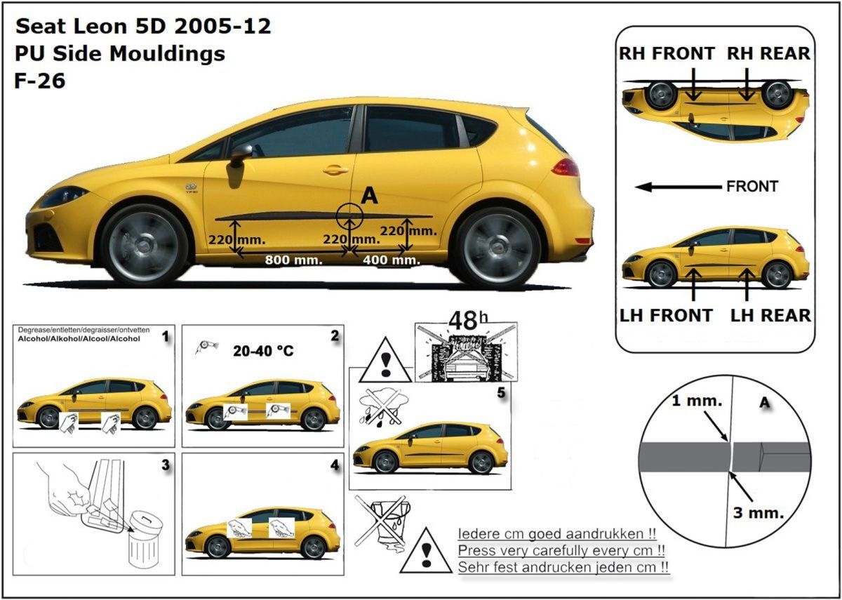 Ochranné lišty jsou vyráběny přesně na konkrétní model vozu, takže budou přesně pasovat na Váš vůz! Jejich montáž je velice snadná pomocí silně lepící pásky 3M, které je včetně odmašťovacích hadříků součástí balení. Návod na montáž.