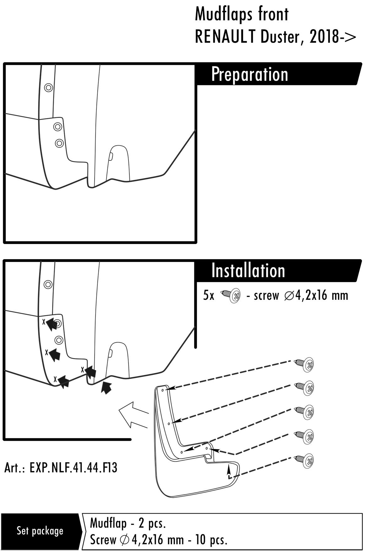 Sada obsahuje 1 pár lapačů. Montáž je velice snadná. Montují se do originálních otvorů vozidel. Součástí balení je spojovací materiál pro přichycení a návod montáže.