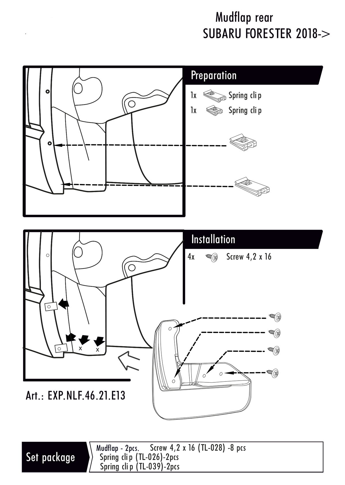 Zástěrky, lapače nečistot, Subaru Forester V, 2018- , přední