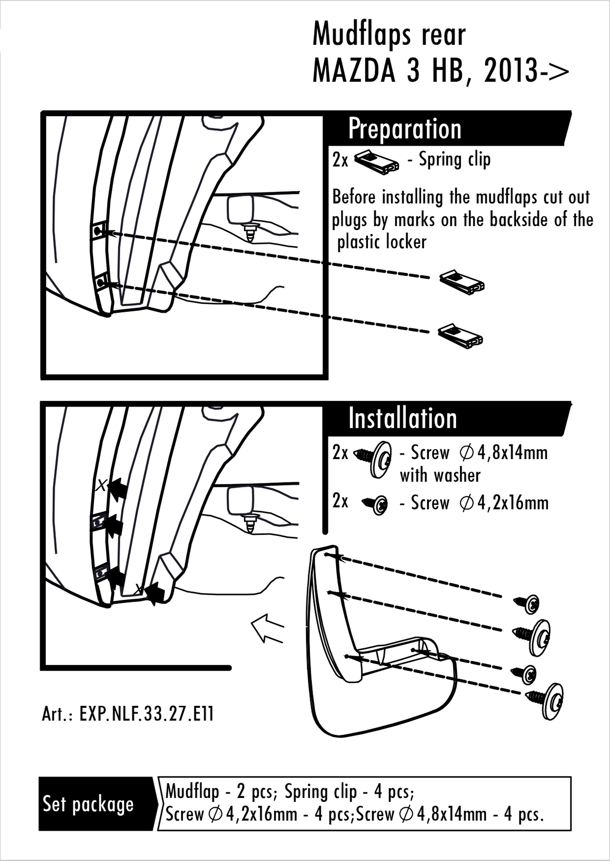 Sada obsahuje 1 pár lapačů. Montáž je velice snadná. Montují se do originálních otvorů vozidel. Součástí balení je spojovací materiál pro přichycení a návod montáže.