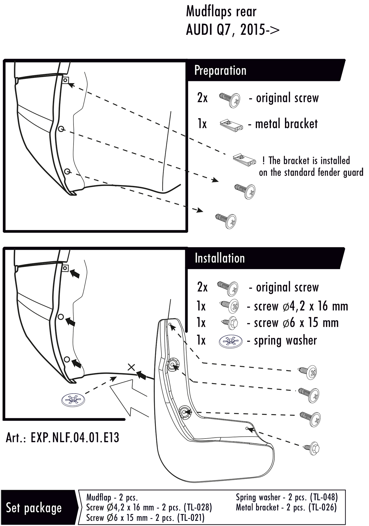 Sada obsahuje 1 pár lapačů. Montáž je velice snadná. Montují se do originálních otvorů vozidel. Součástí balení je spojovací materiál pro přichycení a návod montáže.