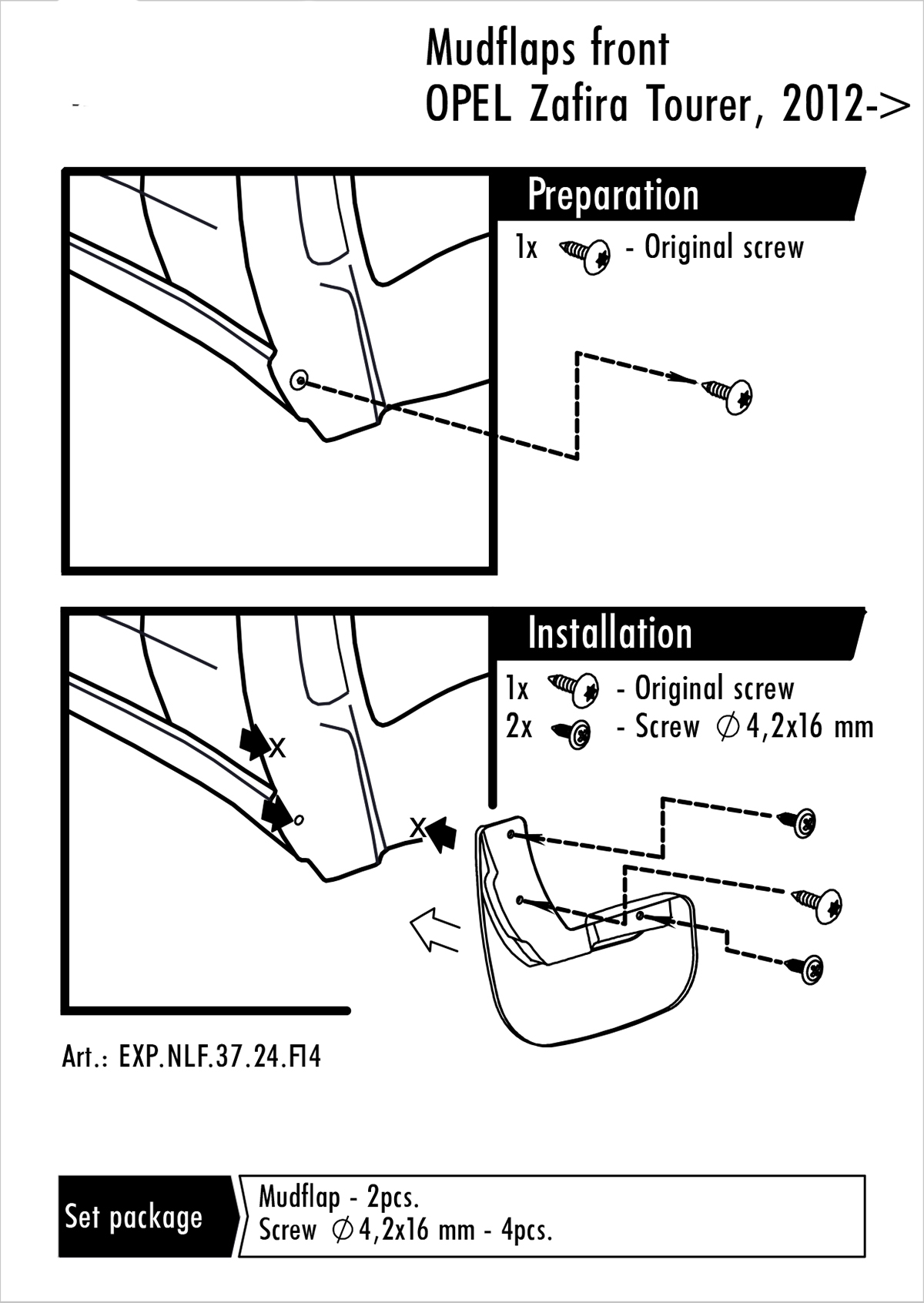 Sada obsahuje 1 pár lapačů. Montáž je velice snadná. Montují se do originálních otvorů vozidel. Součástí balení je spojovací materiál pro přichycení a návod montáže.