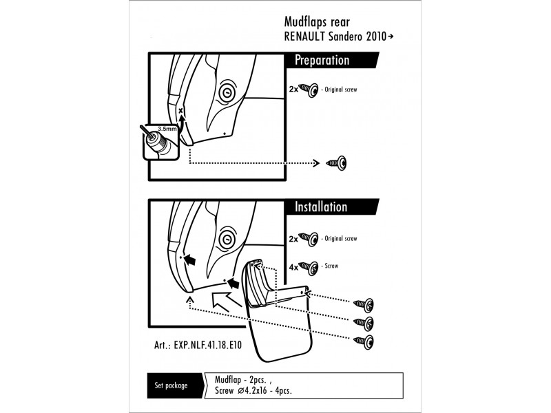 Sada obsahuje 1 pár lapačů. Montáž je velice snadná. Montují se do originálních otvorů vozidel. Součástí balení je spojovací materiál pro přichycení a návod montáže.