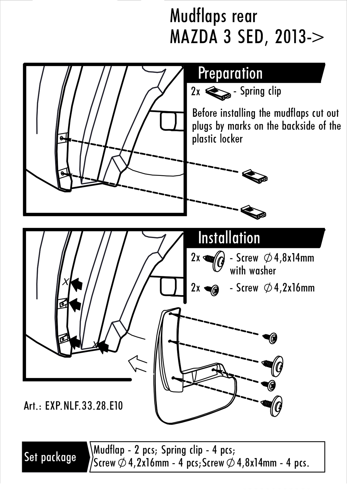 Zástěrky, lapače nečistot, Mazda III, 2013-2018, HTB/SDN, přední