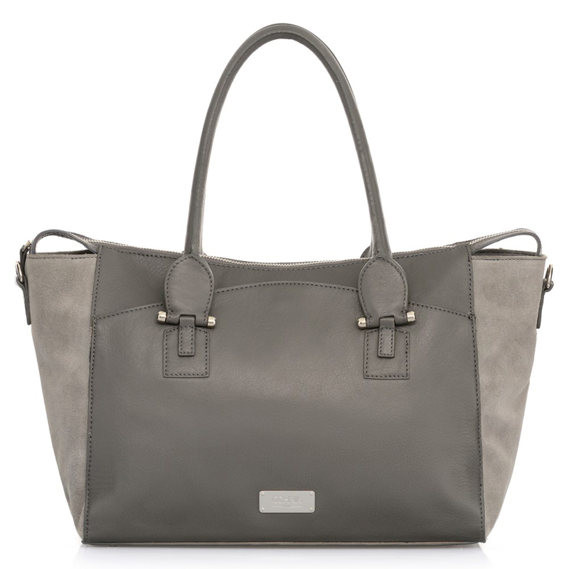 Šedá kožená kabelka do ruky, která skvěle ladí s různými outfity a je ideální pro každodenní nošení.