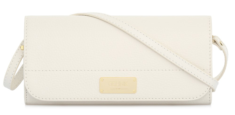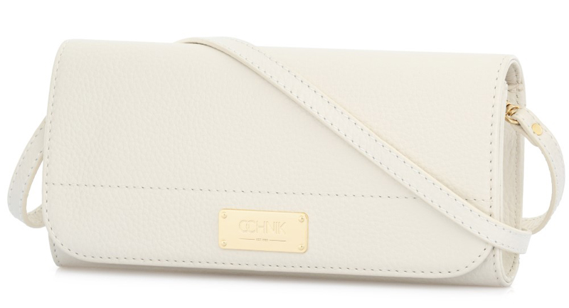 Bílá kožená kabelka ve formě psaníčka, ideální pro elegantní večerní události.