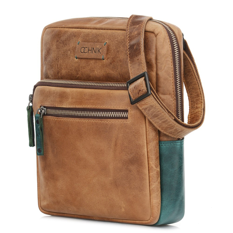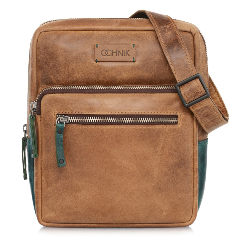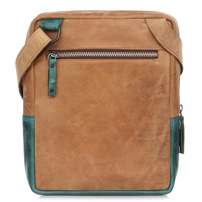 Kožená městská taška ležérního charakteru. Je vyrobena z přírodní, lícové hovězí kůže s výrazným přírodním dezénem. Taška má barvu čajového bronzu s prvky mořské zeleně, doplněnou o specifické vybarvení v několika tónech s lehkým „mazáním“. Jednokomorová, uzavíratelná na zip. Uvnitř 2 otevřené kapsy a jedna kapsa na zip. Na přední i zadní straně jsou dodatkové kapsičky na zip. Taška má komfortní, regulovatelný, koženo-polyesterový popruh, který dovoluje nošení na rameni nebo cross-body.