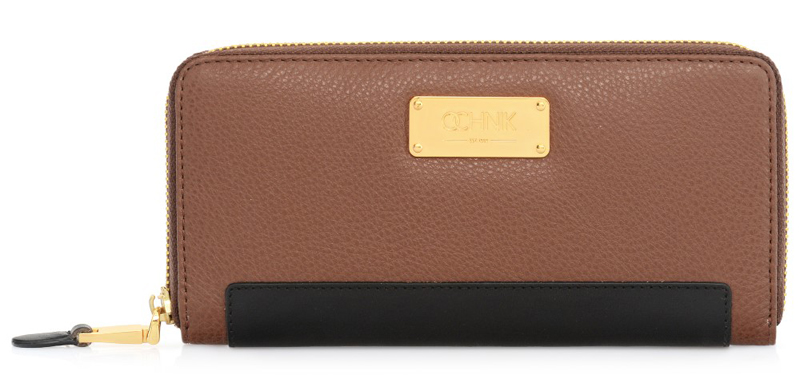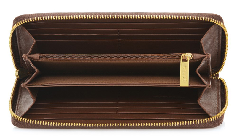 Dámská kožená peněženka, vyrobená z kombinace zrnité hovězí kůže v odstínu tmavého kakaa a z elementů lícové kůže černé barvy. Celá se zapíná na zip. Uvnitř jsou 4 přihrádky, z toho 1 na zip (na mince), 12 míst na karty a tři dodatkové kapsy. Kovové prvky jsou v barvě zlata.