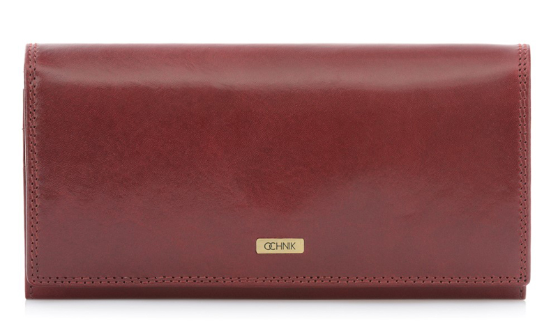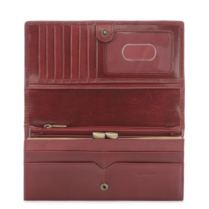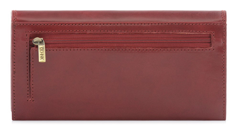 Dámská peněženka vyrobená z přírodní hovězí kůže vysoké kvality v temně červené barvě. Má 5 kapes na bankovky, z toho 1 na zip, 12 míst na karty, z toho jedna průhledná, velkou kapsu na mince uvnitř a dvě dodatkové kapsy. Celá je uzavíratelná stiskacím knoflíkem.