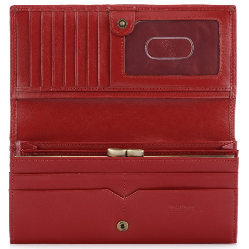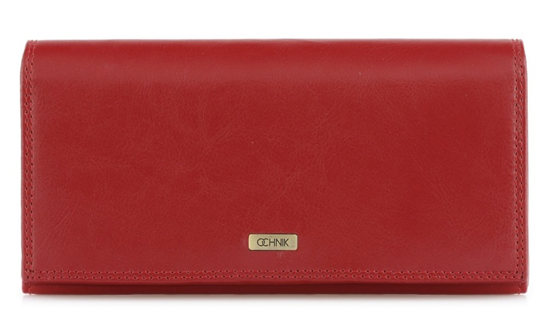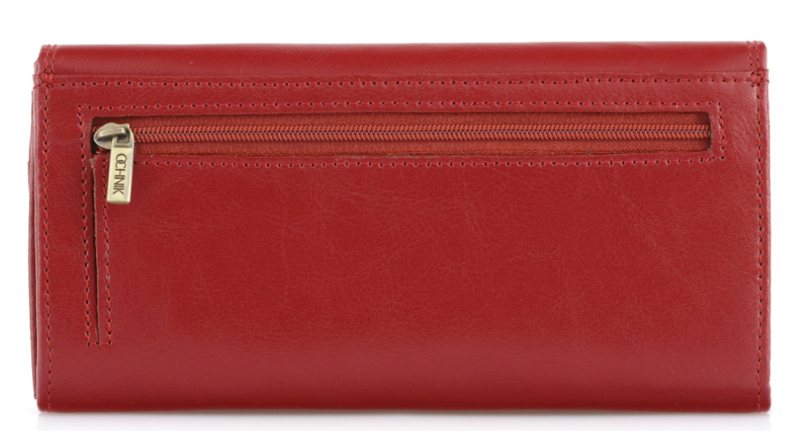 Dámská peněženka vyrobená z lícové hovězí kůže s charakteristickým přírodním dezénem červené barvy. Celá se uzavírá stiskacím knoflíkem. Uvnitř se nachází 12 míst na karty, z toho 1 průhledná kapsička na občanský průkaz nebo řidičský průkaz, 5 kapsiček na bankovky, z toho 1 na zip, 1 kapsa na mince a 2 dodatkové kapsy. Zezadu z vnější strany kapsa na zip.