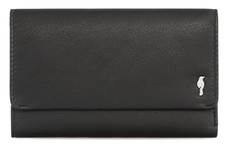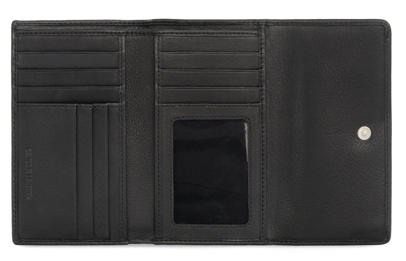 Dámská peněženka vyrobená z přírodní, hovězí lícové kůže černé barvy. Lze ji zapnout stiskacím knoflíkem. Uvnitř 2 kapsičky na bankovky, 9 míst na karty, 2 kapsy například na občanský průkaz, z toho jedna průhledná a 2 dodatkové kapsy. Kovové prvky v barvě niklu.