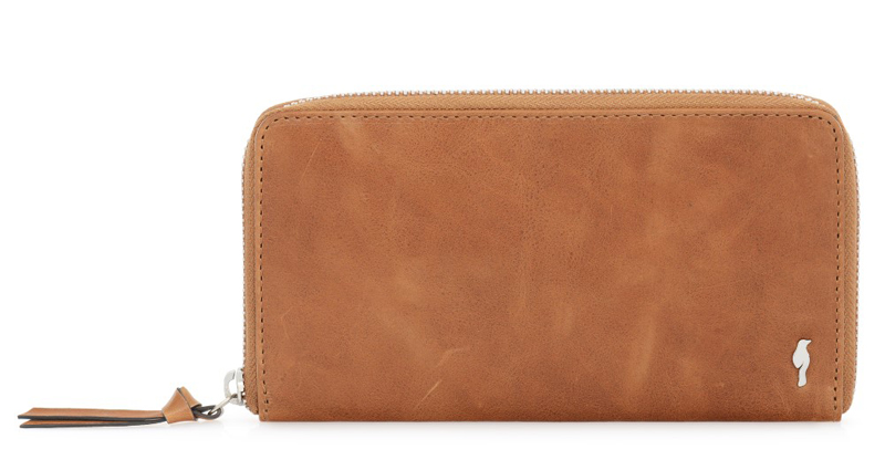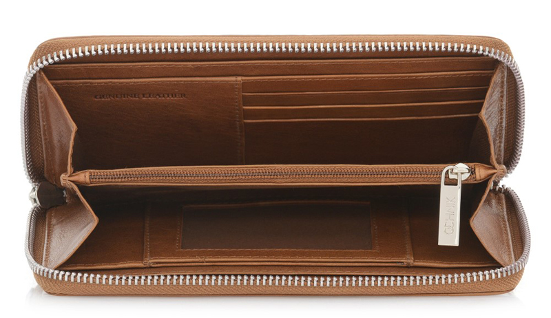 Dámská peněženka vyrobená z přírodní hovězí kůže s přírodním dezénem, v čajové barvě s lehce stínovým zakončením. Celá uzavíratelná na zip. Uvnitř 3 přihrádky, z čehož 1 na zip (na mince), 3 místa na karty a 1 průhledná kapsa, například na občanský průkaz a 4 dodatkové kapsičky. Kovové prvky v barvě niklu.