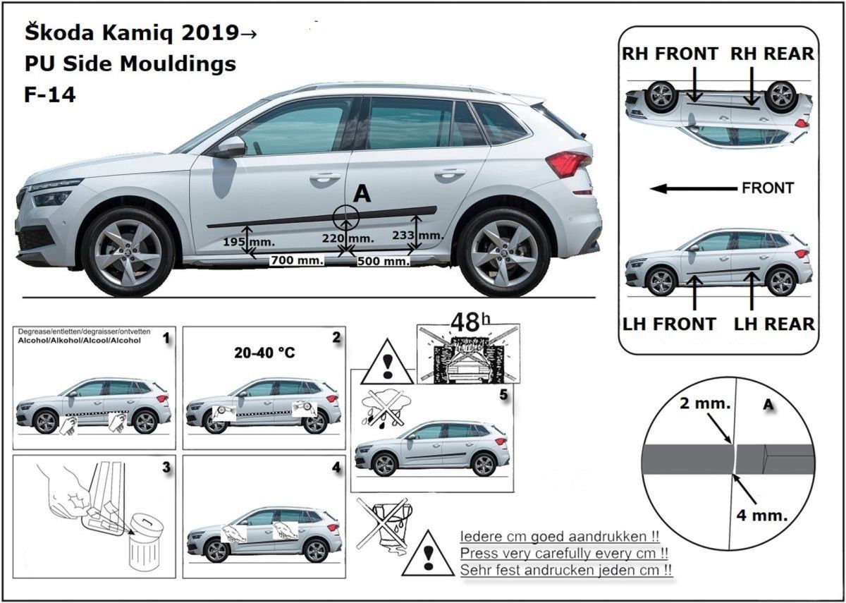 Ochranné lišty jsou vyráběny přesně na konkrétní model vozu, takže budou přesně pasovat na Váš vůz! Jejich montáž je velice snadná pomocí silně lepící pásky 3M, které je včetně odmašťovacích hadříků součástí balení. Návod na montáž.