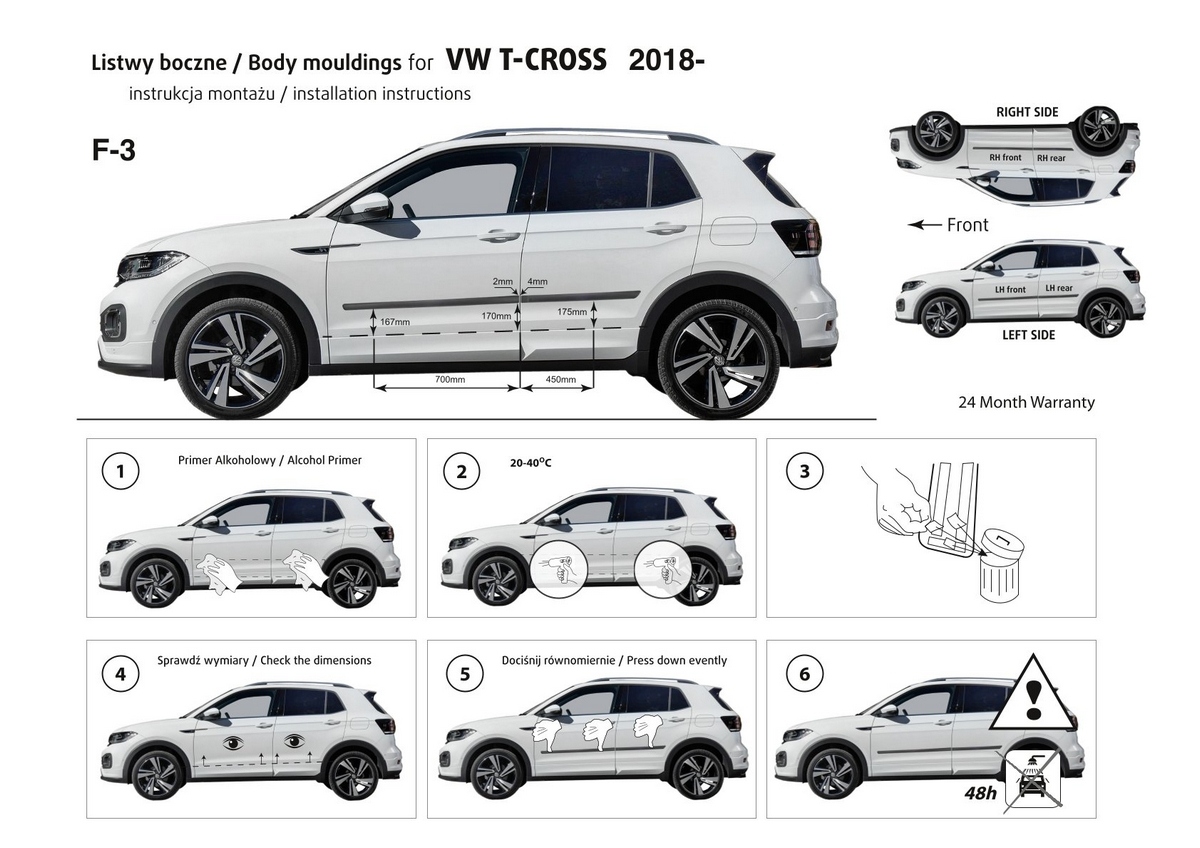 Ochranné lišty jsou vyráběny přesně na konkrétní model vozu, takže budou přesně pasovat na Váš vůz! Jejich montáž je velice snadná pomocí silně lepící pásky 3M, které je včetně odmašťovacích hadříků součástí balení. Návod na montáž.