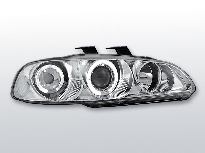 Přední světla projektorová (čočky) s diodovými kroužky Angel Eyes. Chromované s integrovanýma směrovkama