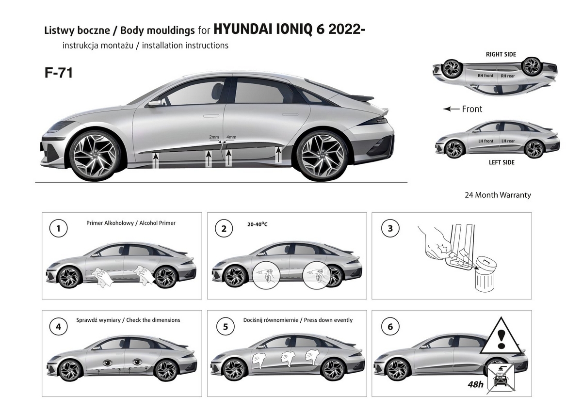 Ochranné lišty jsou vyráběny přesně na konkrétní model vozu, takže budou přesně pasovat na Váš vůz! Jejich montáž je velice snadná pomocí silně lepící pásky 3M, které je včetně odmašťovacích hadříků součástí balení. Návod na montáž.