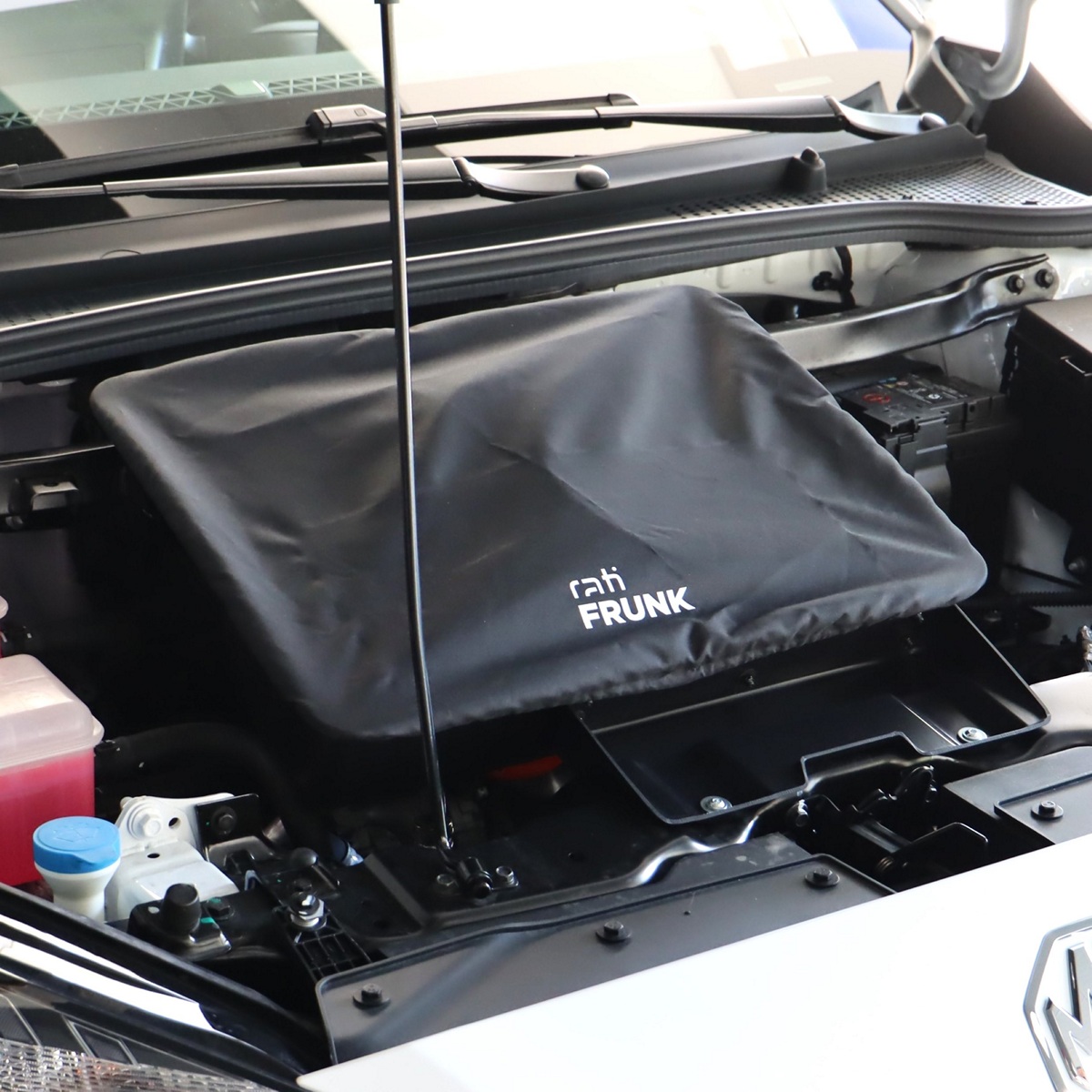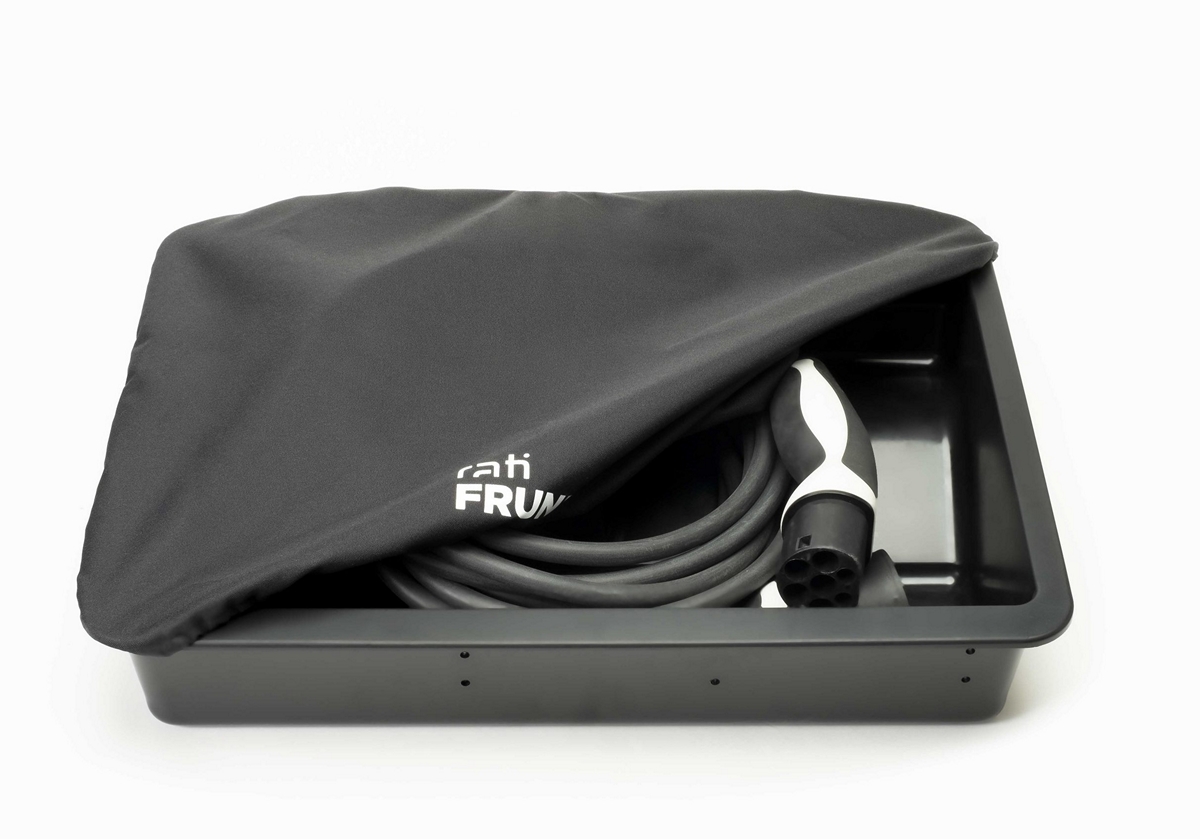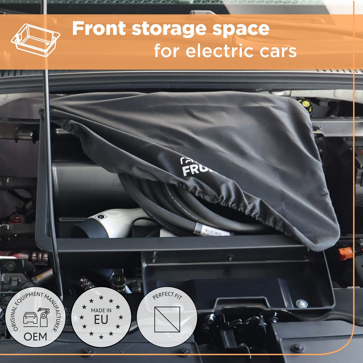 Frunk je vybaven elastickým krytem, který efektivně chrání uložené věci proti poškození, zašpinění a nepříznivým vlivům prostředí, což zvyšuje jeho praktičnost a využitelnost pro majitele elektrických vozidel.