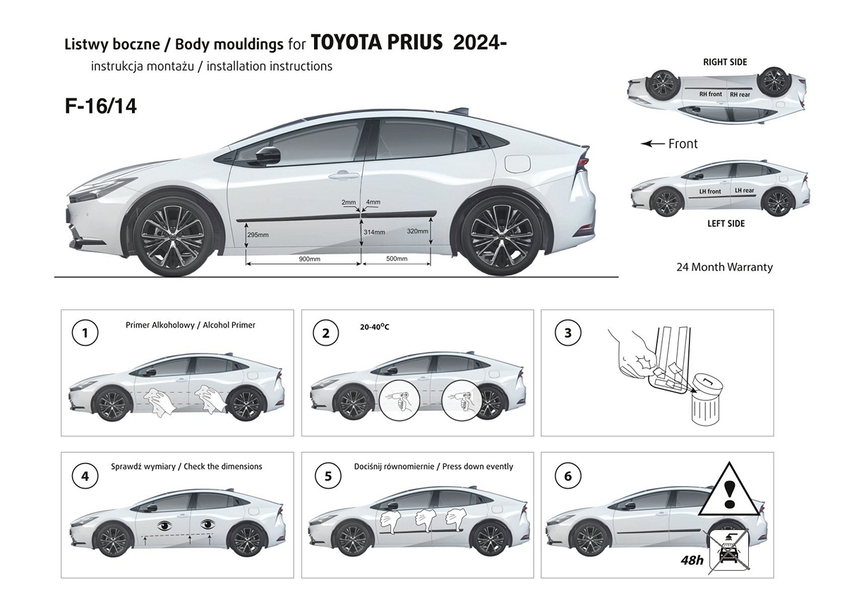Ochranné lišty jsou vyráběny přesně na konkrétní model vozu, takže budou přesně pasovat na Váš vůz! Jejich montáž je velice snadná pomocí silně lepící pásky 3M, které je včetně odmašťovacích hadříků součástí balení. Návod na montáž.