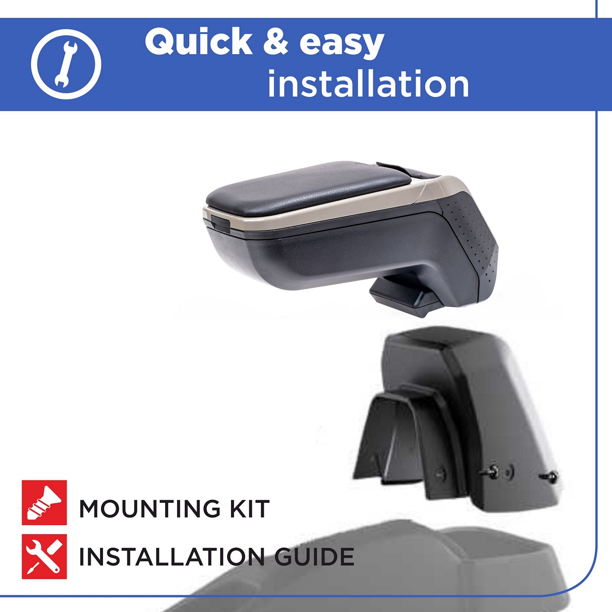 Montáž samotné opěrky je naprosto jednoduchá, není nutné navštěvovat autoservis. Návod je součástí balení. Adaptéry pro montáž loketní opěrky jsou vyráběny na konkrétní typy vozidel, a proto dokonale pasují. Nedostane se Vám do rukou žádný univerzální adaptér, který by způsobil problémy při montáži.