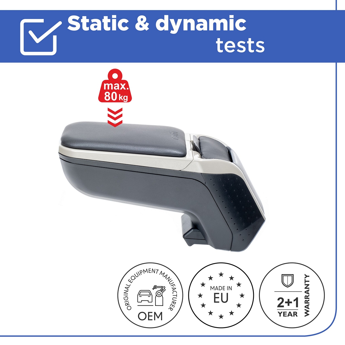 Vrchní část loketní opěrky je potažena umělou kůží používanou v automobilovém průmyslu a lze ji vysunout až o 5 cm, čímž se zvětší opěrná plocha. Na eleganci loketní opěrce dodává rámeček v barvě šeého titánu. Tělo je vyrobeno z černého ABS plastu.Loketní opěrky do auta slibují zpříjemnění každé jízdy v automobilu. Díky kvalitnímu materiálu, z něhož jsou loketní opěrky vyrobeny, je zaručeno větší pohodlí, které při cestování ocení nejen řidič, ale i ostatní pasažéři ve vozidle. Loketní opěrky se pyšní dlouhou životností, moderním vzhledem, funkčností a samozřejmě odkládacím prostorem, který lze využít na odkládání osobních věcí.