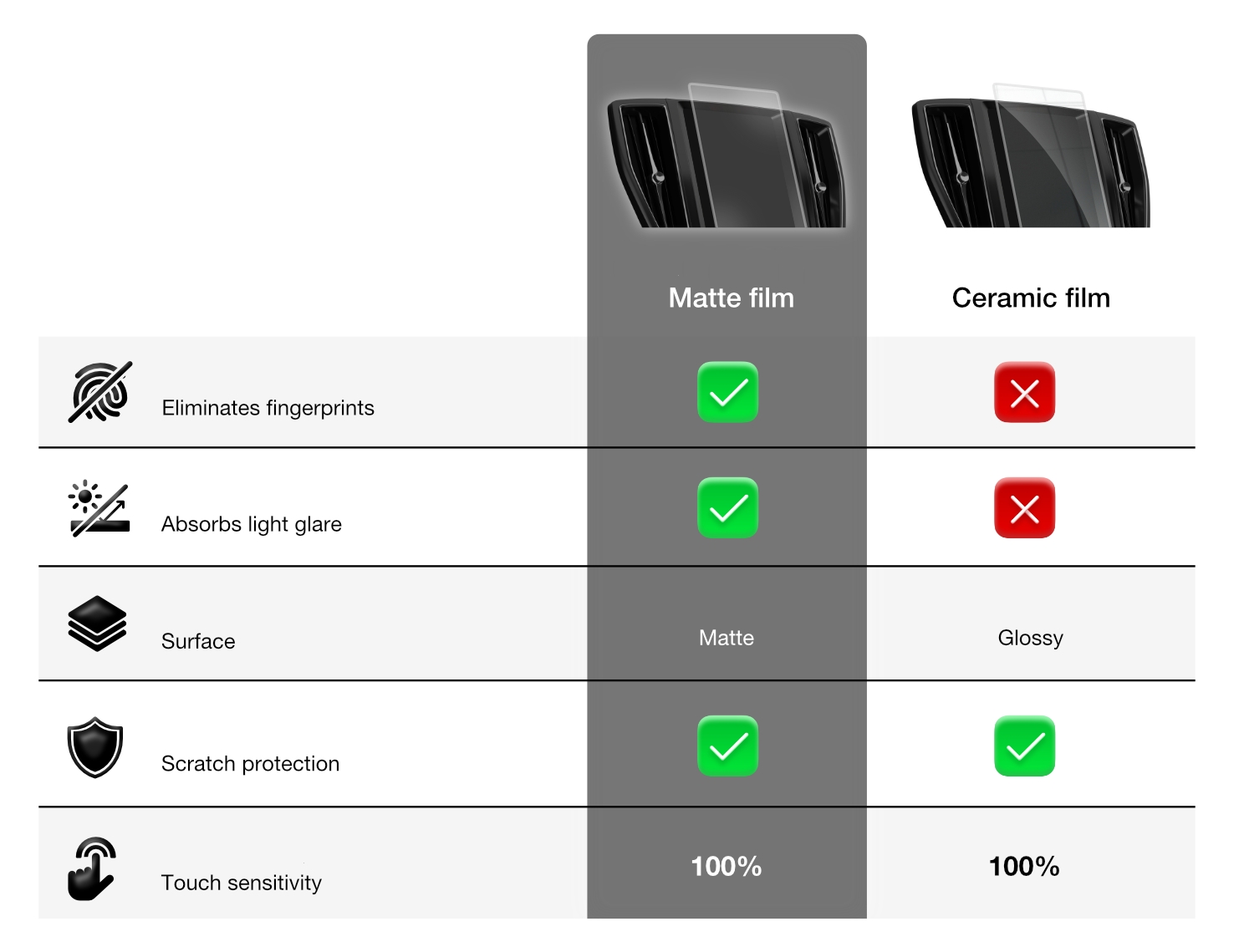 GRIZZ CarDisplay Protection Matte Film je profesionální ochranná fólie pro displeje moderních vozidel. Matný povrch účinně snižuje odlesky a zlepšuje čitelnost. Zároveň spolehlivě chrání obrazovku před poškrábáním, prachem a každodenní mastnotou – a to bez kompromisu v kvalitě obrazu.
