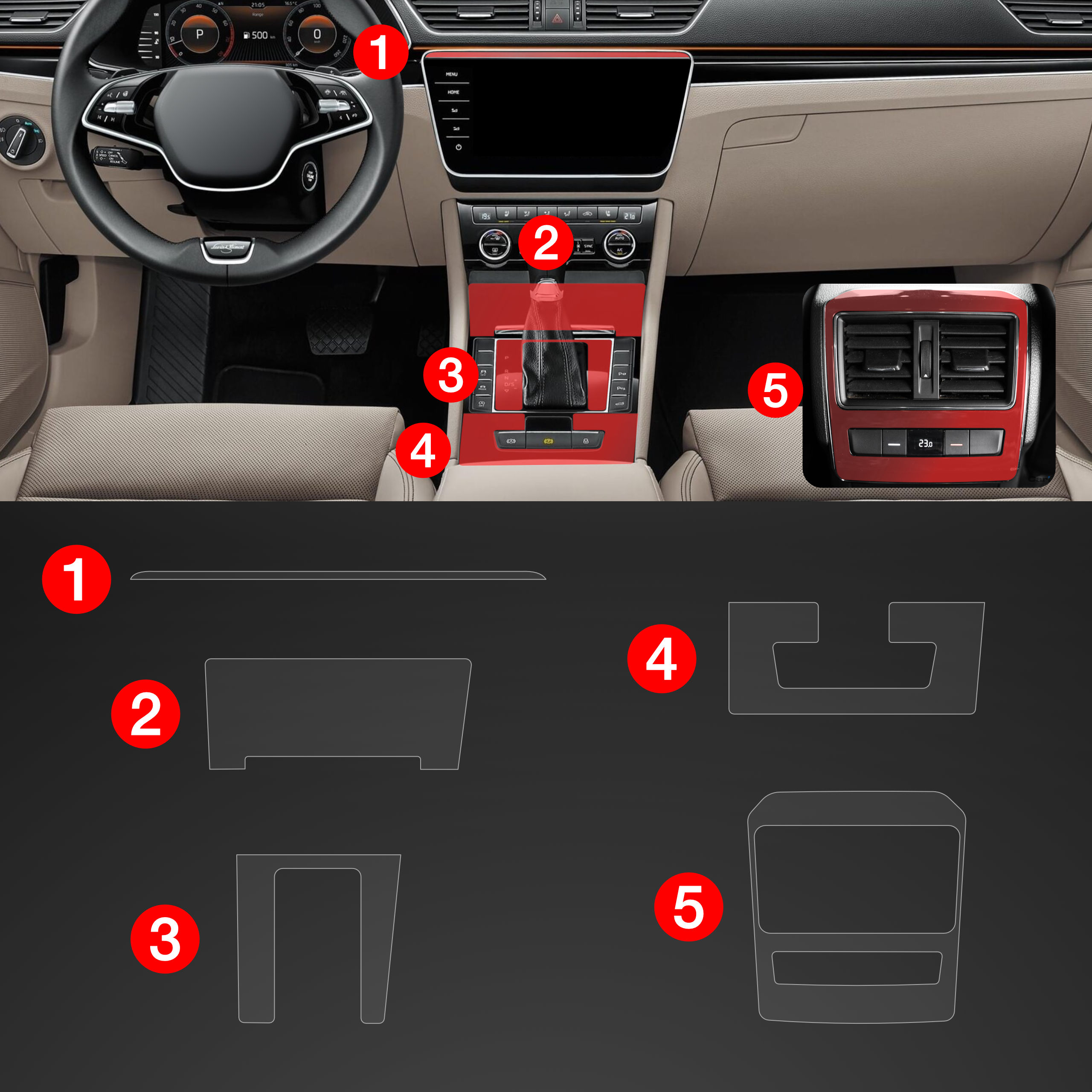 Ochranná fólie interiéru PianoSkin 5v1, Škoda Superb III, 2015-2024