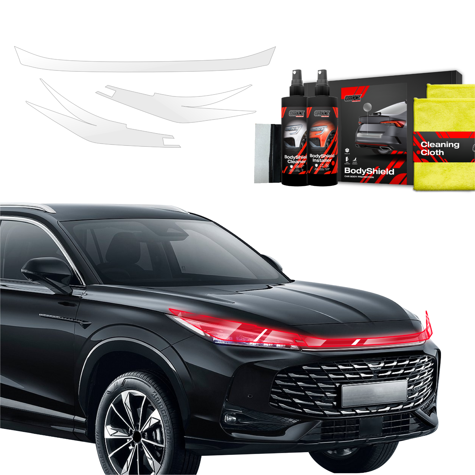 Grizz BodyShield je prvotřídní ochranná fólie navržená k ochraně laku vašeho vozidla před mechanickým poškozením a nepříznivými vlivy. Díky vysoké pružnosti a samoregenerační schopnosti dokáže vyplnit drobné škrábance a udržet povrch vozidla v perfektním stavu. Fólie je vyříznuta na míru konkrétním modelům aut, což zajišťuje snadnou instalaci a bezchybné přizpůsobení.