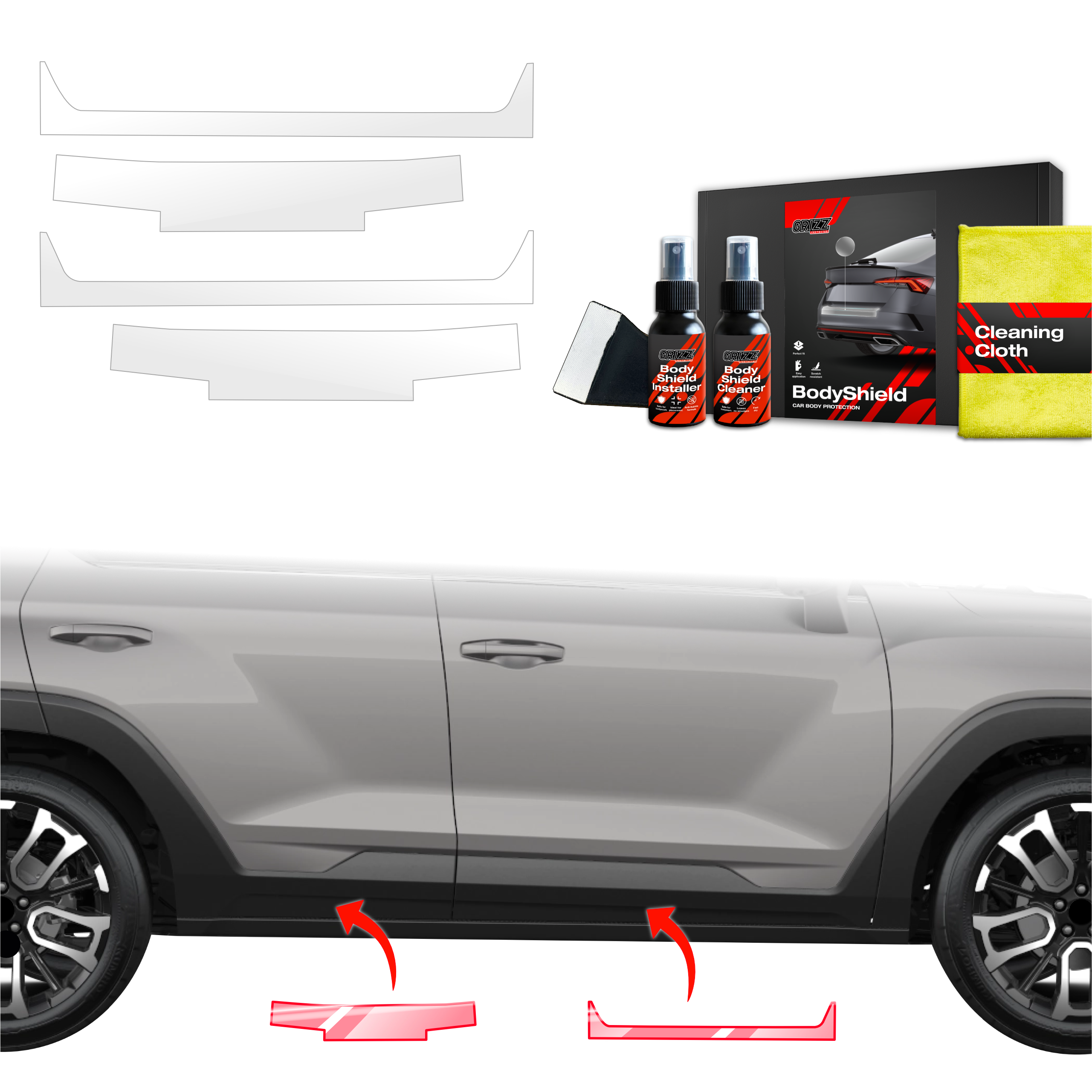Grizz BodyShield je prvotřídní ochranná fólie navržená k ochraně laku vašeho vozidla před mechanickým poškozením a nepříznivými vlivy. Díky vysoké pružnosti a samoregenerační schopnosti dokáže vyplnit drobné škrábance a udržet povrch vozidla v perfektním stavu. Fólie je vyříznuta na míru konkrétním modelům aut, což zajišťuje snadnou instalaci a bezchybné přizpůsobení.