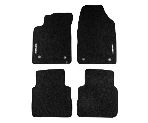 Textilní autokoberce Horizon jsou navrženy na míru pro konkrétní modely vozidel, čímž zajišťují maximální přizpůsobení a stabilitu. Díky pevnému uchycení na klipy nebo suchý zip se během jízdy neposouvají, což zvyšuje bezpečnost a pohodlí řidiče i spolujezdců. Koberce jsou vyrobeny z kvalitní smyčkové textilie, která je odolná proti oděru a zároveň příjemná na dotek.