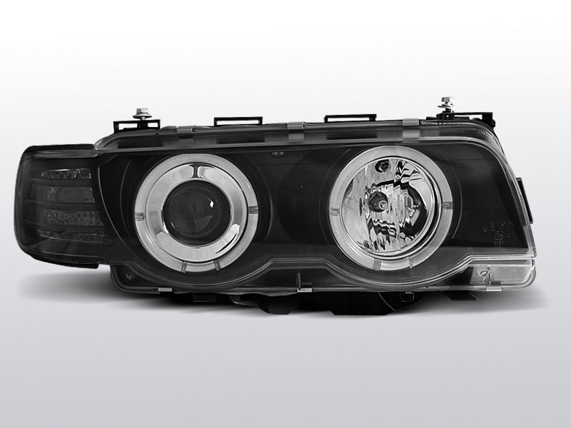 Přední světla projektorová (čočky) s diodovými kroužky Angel Eyes. Černé s integrovanými směrovkami.