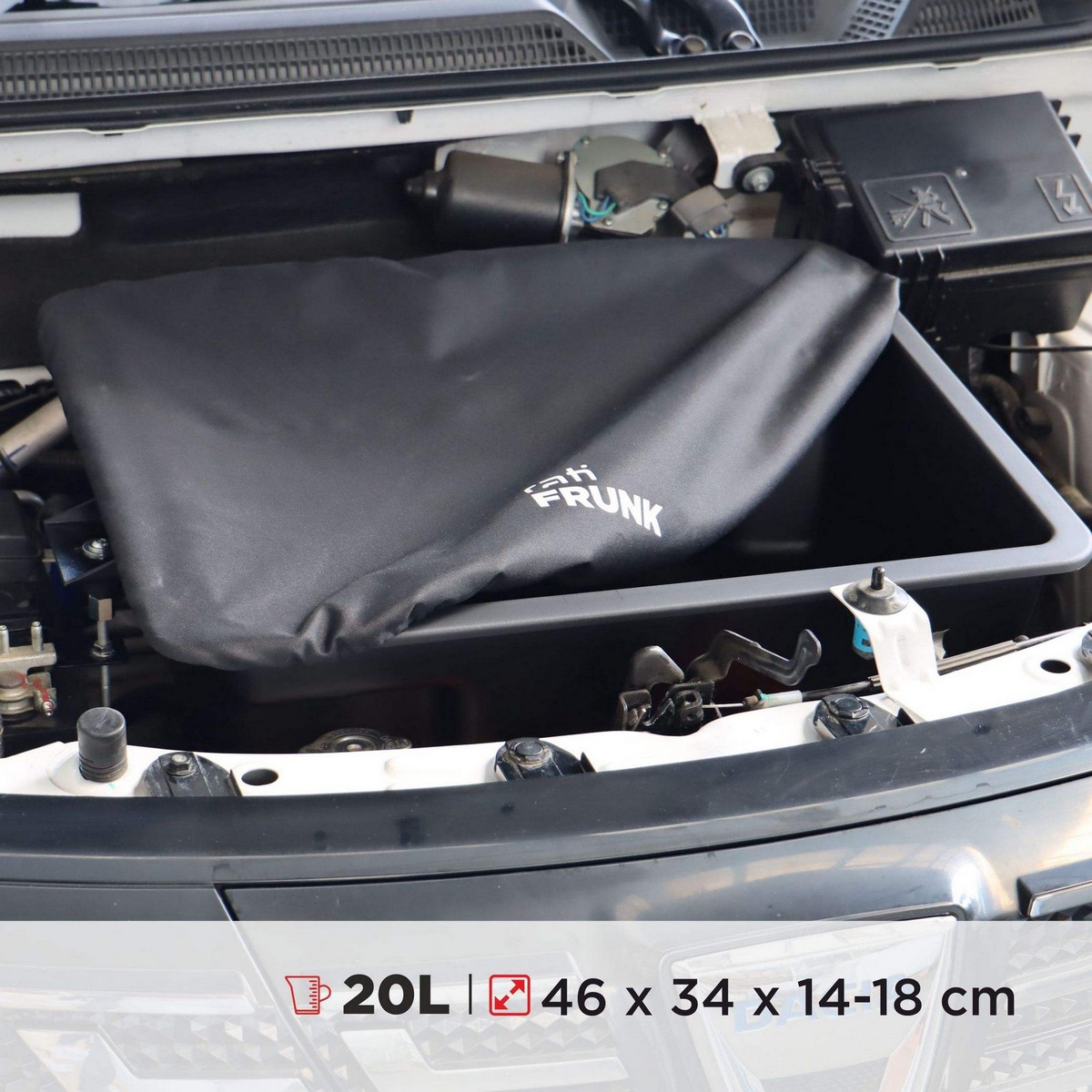 Frunk má kompaktní rozměry 46×34×14–18 cm a objem 20 litrů, což z něj činí ideálního společníka pro denní použití. Instalace frunku je snadná a trvá přibližně 15 minut díky montážní sadě, která je součástí balení. S frunkem se tak stává prostor pod kapotou elektrického auta nejen praktickým, ale i funkčním a bezpečným úložištěm pro vše, co potřebujete při svých cestách.