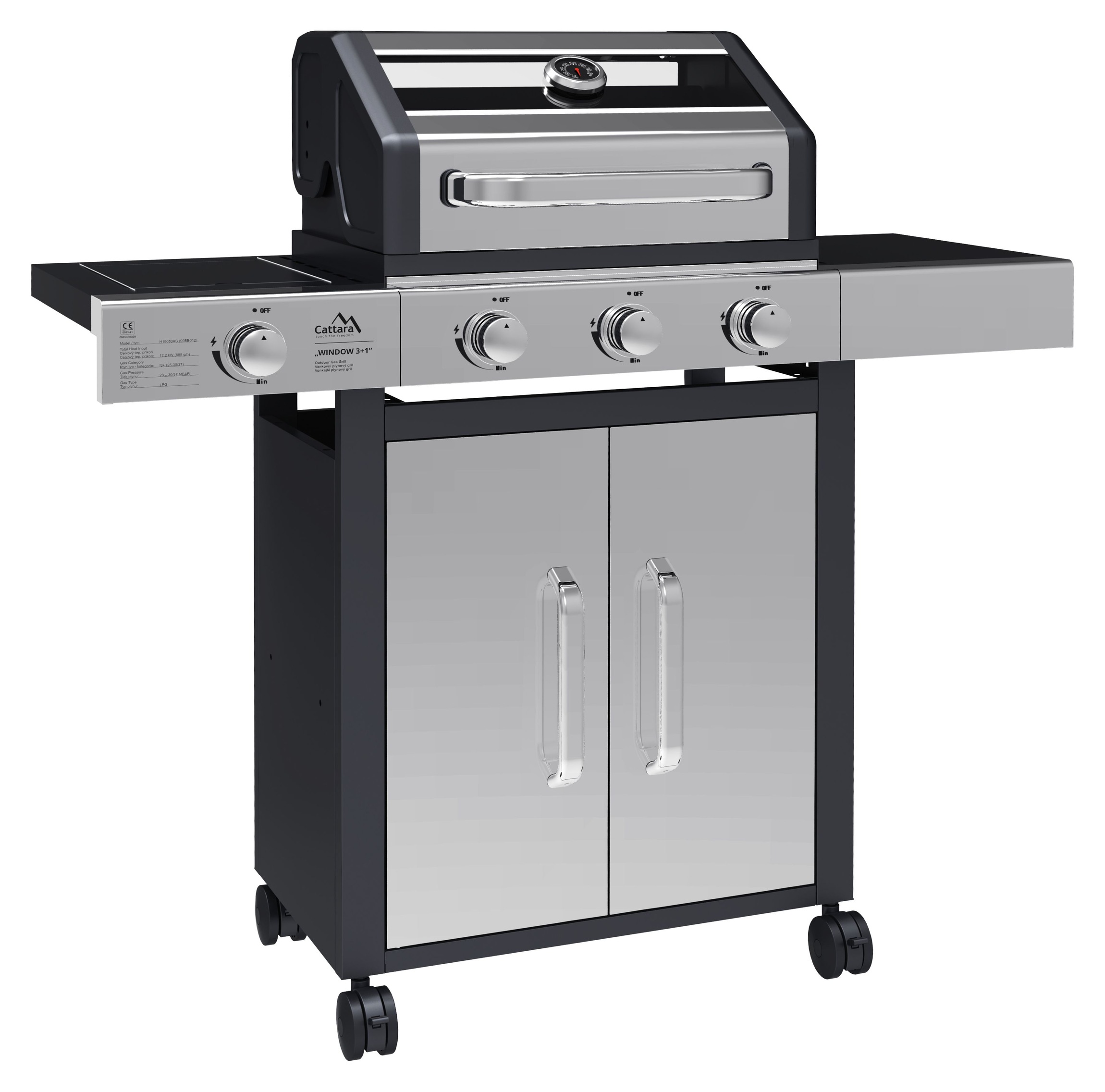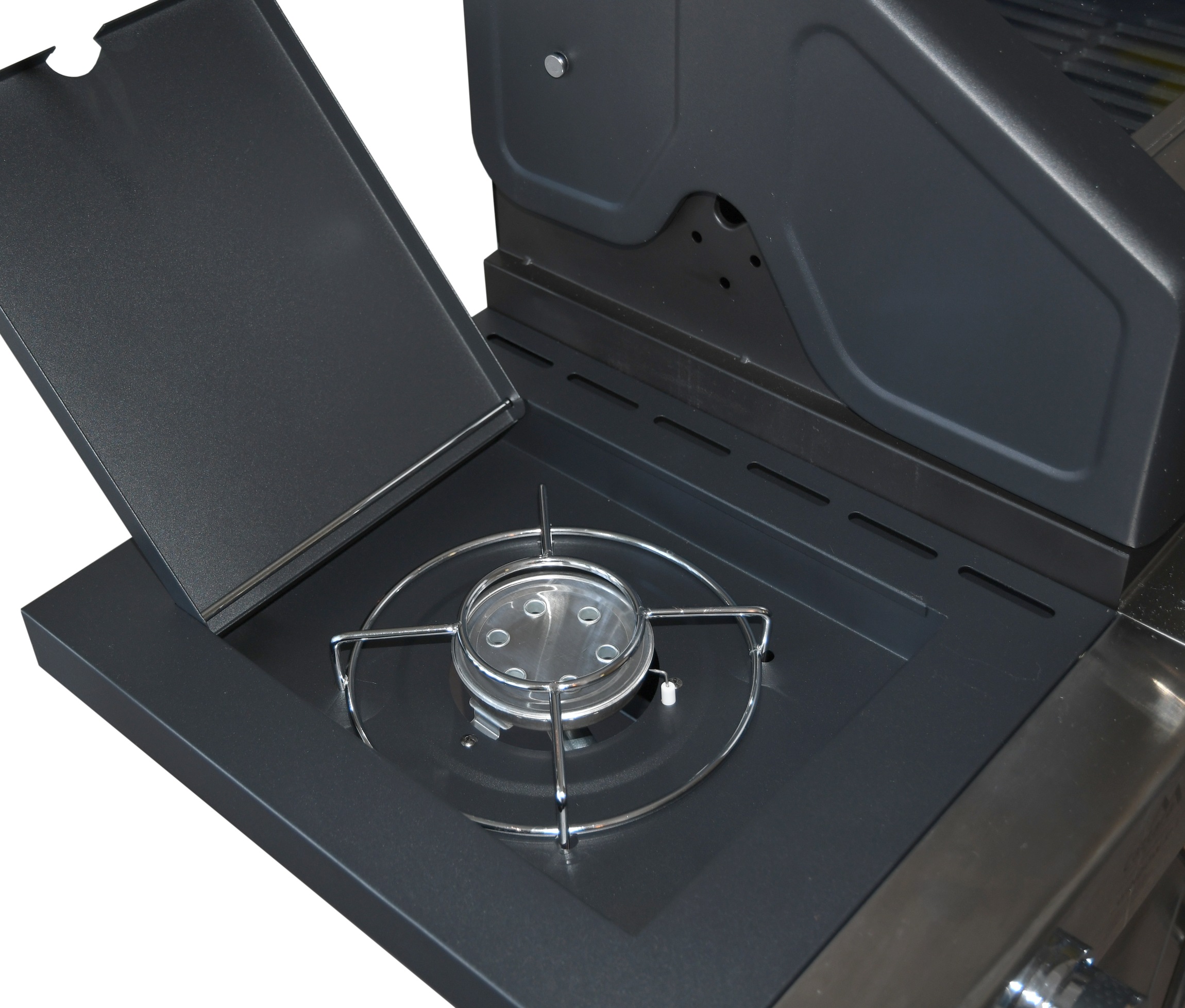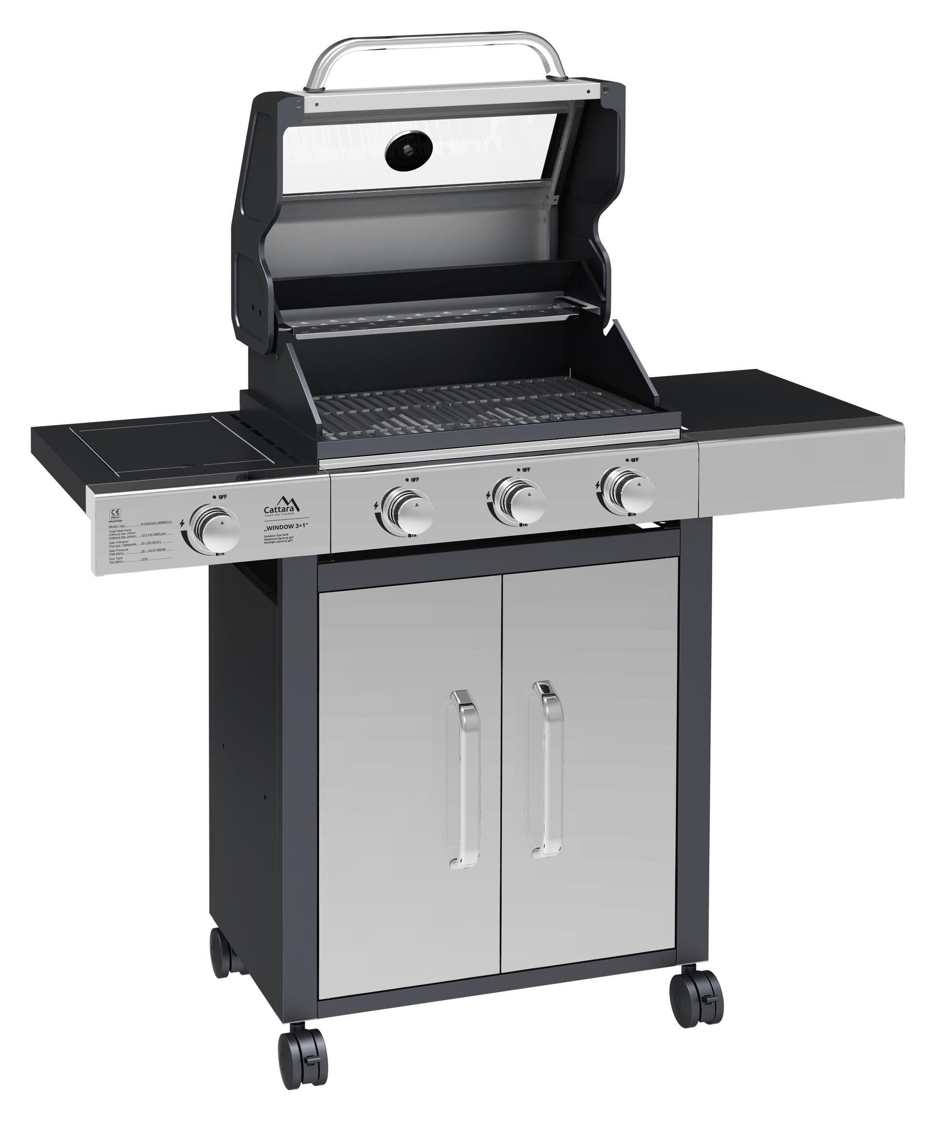 Sklopné víko grilu je opatřeno průzorem, díky kterému je možné sledovat stav grilovaných pokrmů bez otevírání grilu. Gril je vybaven odkládacími poličkami na obou stranách, z nichž jedna je doplněna o boční vařič. Součástí je i spojovací hadice k plynové lahvi a redukční ventil.