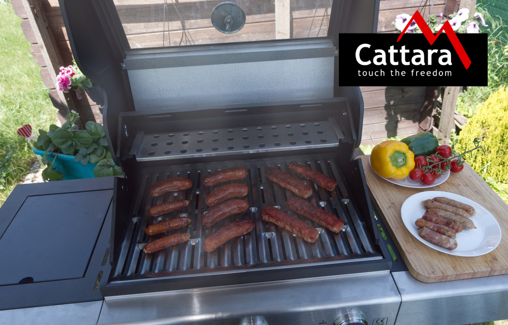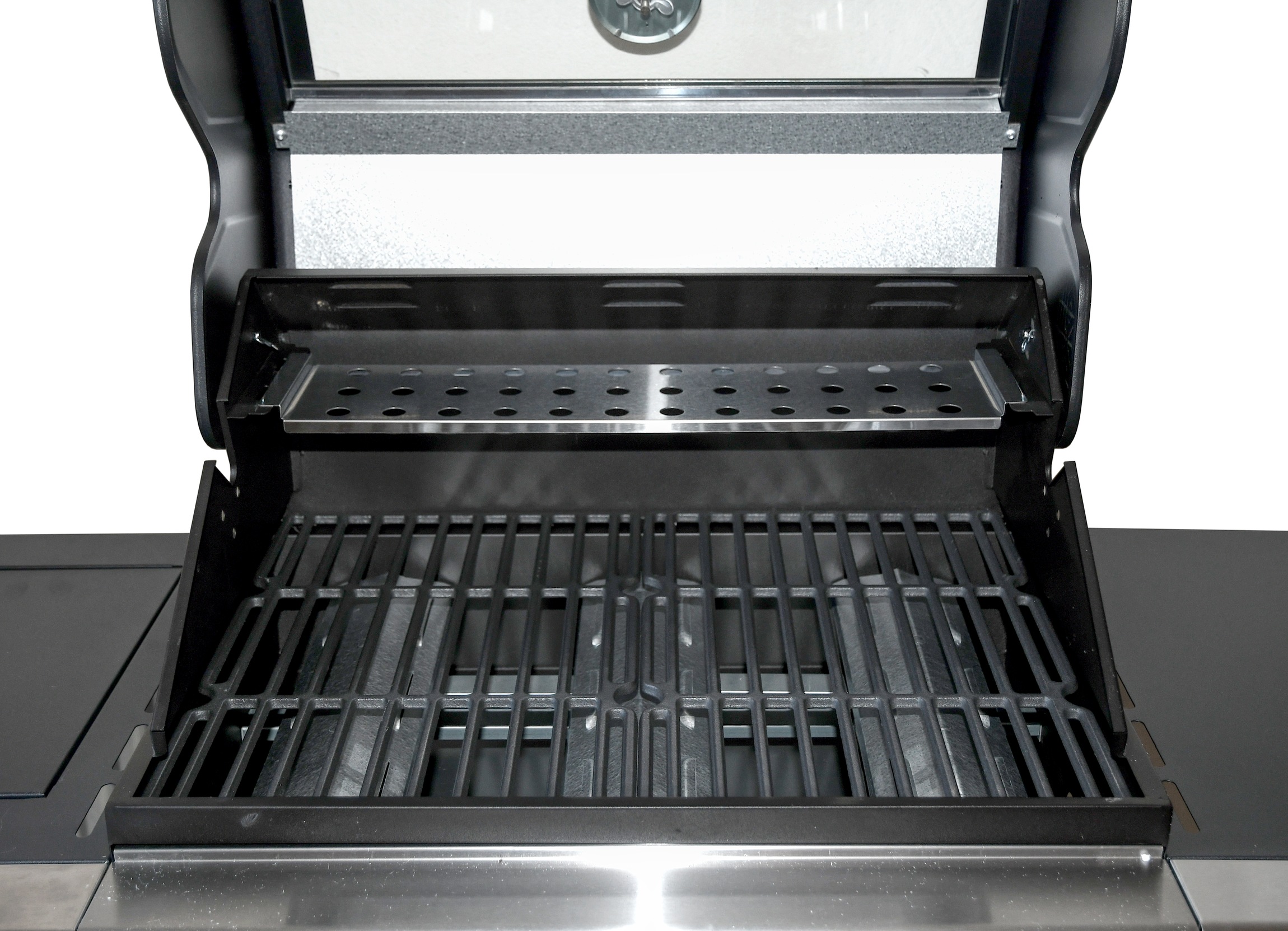 Plynový zahradní gril se systémem Flame Tamer - nevyžaduje lávové kameny. Trojitý hlavní a jeden boční nerezový hořák s piezo zapalováním a plynulou regulací.