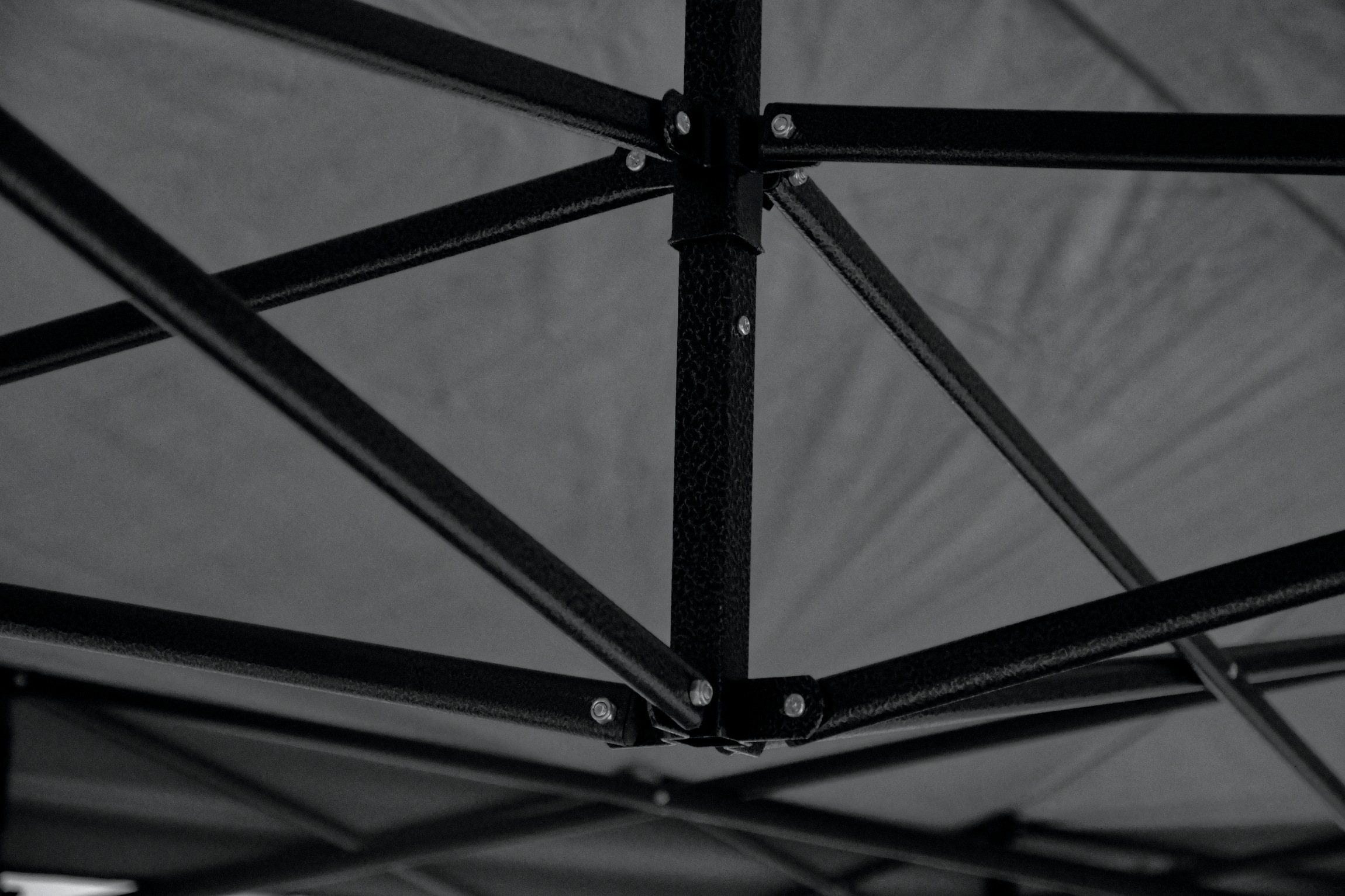 Důmyslná konstrukce stanu z oceli zajistí rychlé sestavení i složení. Nohy konstrukce jsou opatřeny pružnými pojistkami, které zajistí bezpečný a rychlý způsob nastavení vhodné výšky stanu. Nohy jsou ve spodní části opatřeny patkou, se dvěma 7 mm otvory pro případné ukotvení (kolíky pro ukotvení nejsou součástí balení).