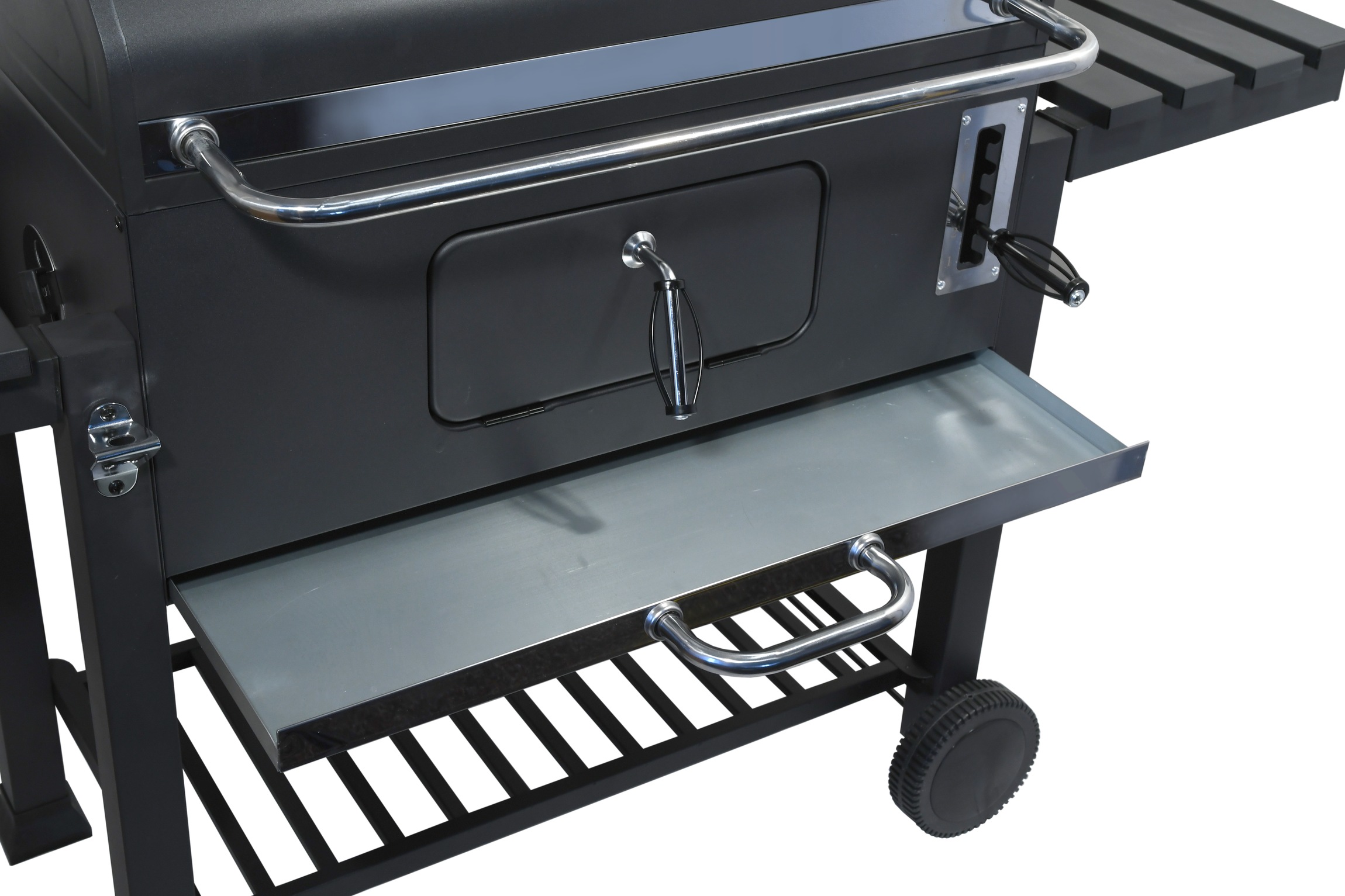 Další předností grilu je rošt na uhlí s nastavitelnou výškou, grilovací prostor je tak možné regulovat pomocí mechanismu na přední straně, dle požadávků daných pokrmů. Dvířka na čelní straně grilu významně usnadňují doplňování uhlí. Pro usnadněné číštění je potom určena zásuvka na popel v nejspodnější části grilovacího prostoru.