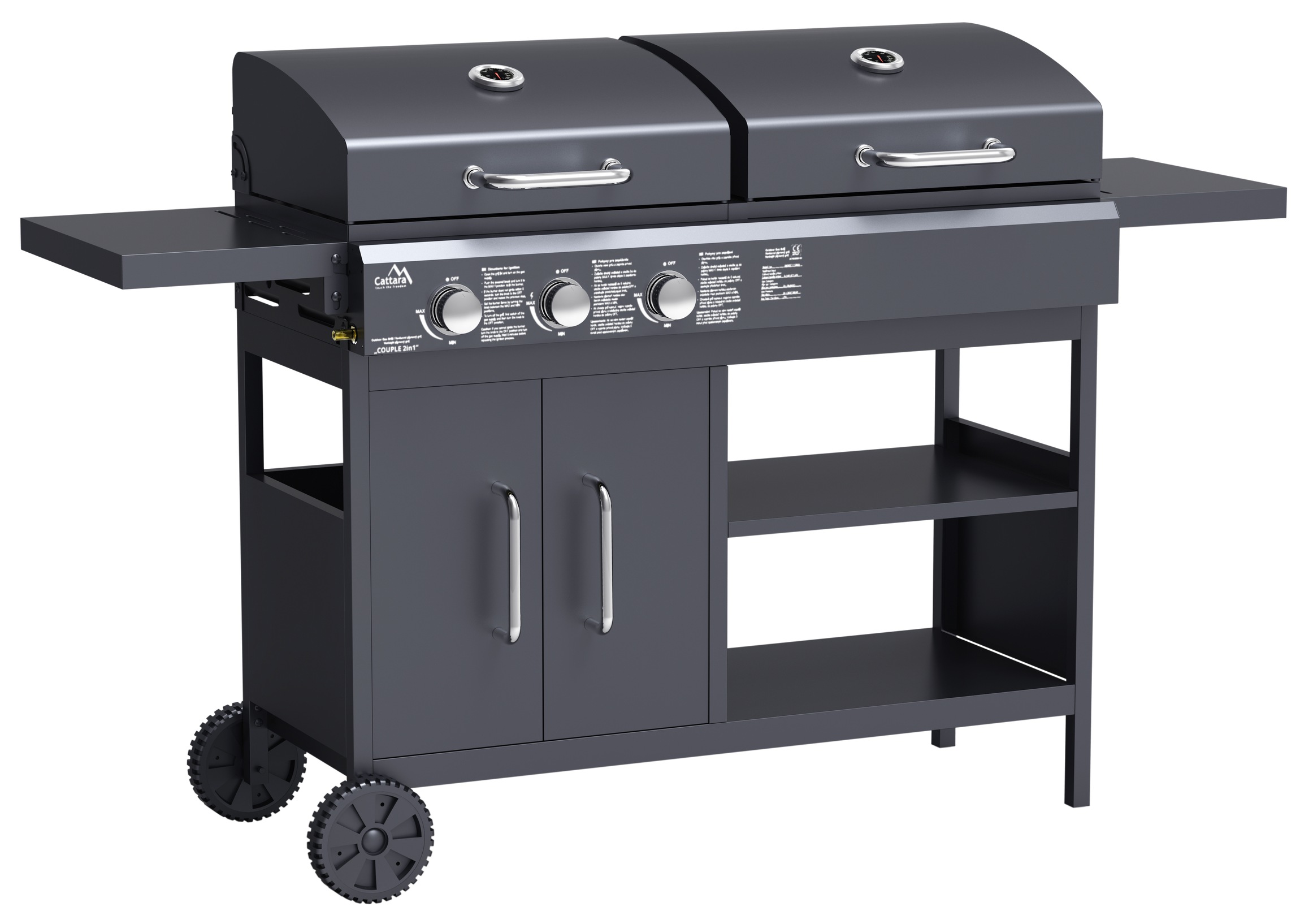 Gril COUPLE je kombinovaný gril s jedním prostorem pro grilování na plynu a jedním prostorem pro grilování na dřevěném uhlí. Je určen především pro zahrady a terasy.