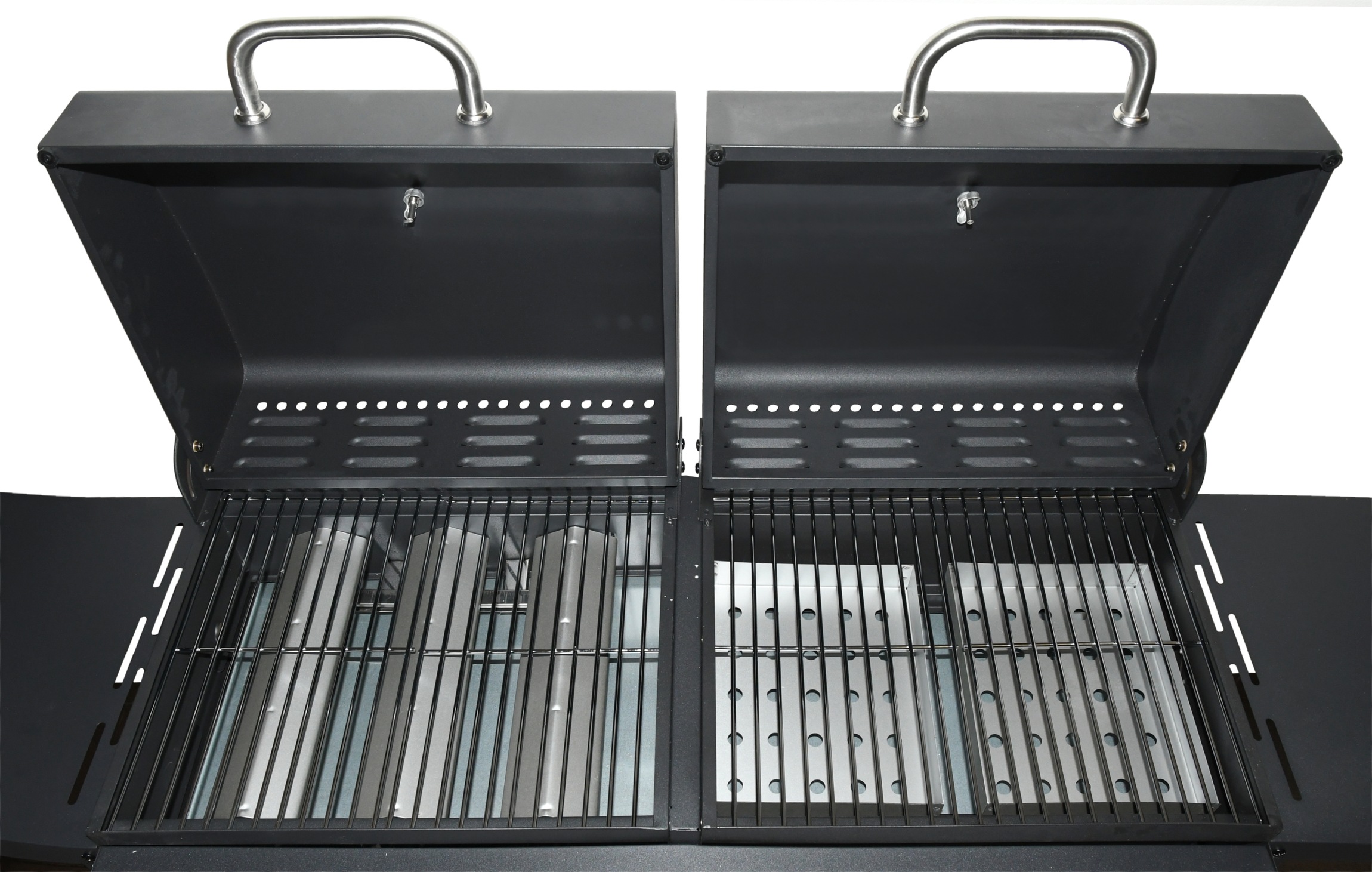 Konstrukce je vyrobena z kvalitní oceli s odolným černým povrchem. Madla z nerezi mají dostatečný prostor pro úchop a zvyšují eleganci grilu. Gril je opatřen kolečky z odolného plastu pro zajištění dostatečné pohyblivosti. Víka grilu jsou opatřena teploměry a boky grilovacích prostorů jsou doplněny regulovatelnou ventilací.
