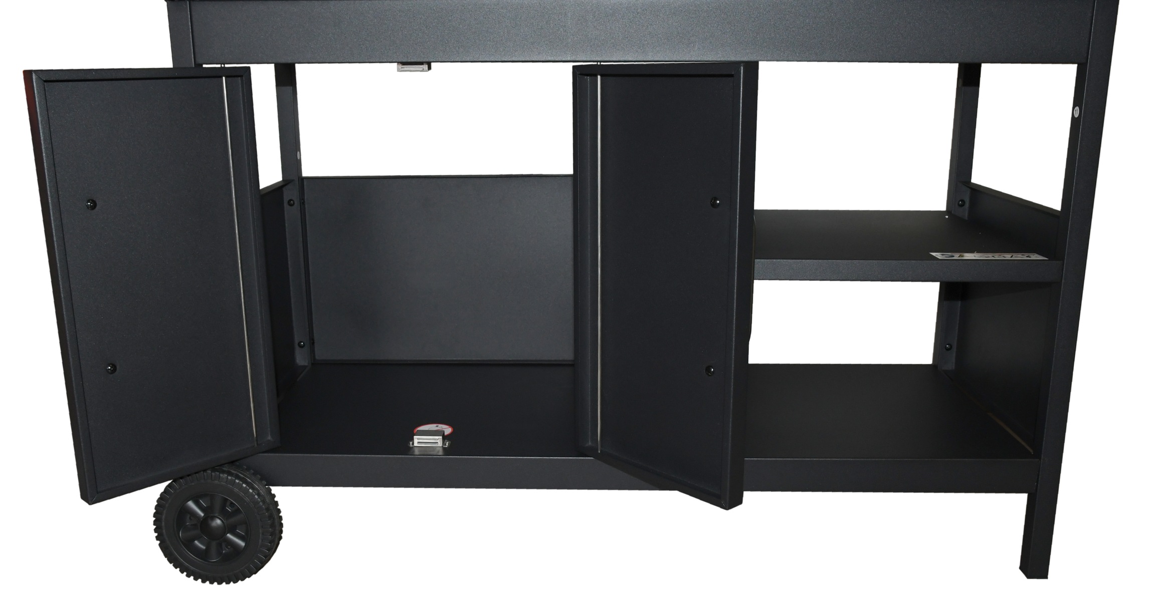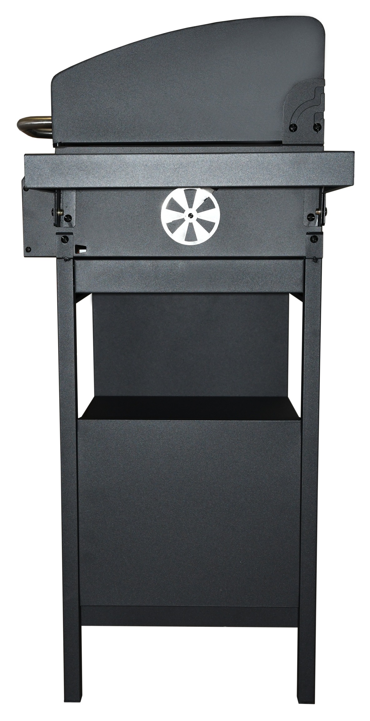 Odkládací prostor tvoří skříňka s rozměry 46 x 47 cm opatřená dvířky v části pod plynovým grilem, 2x patrová polička v části pod grilem na uhlí a skládací poličky na bocích grilu s rozměry 39 x 28 cm.