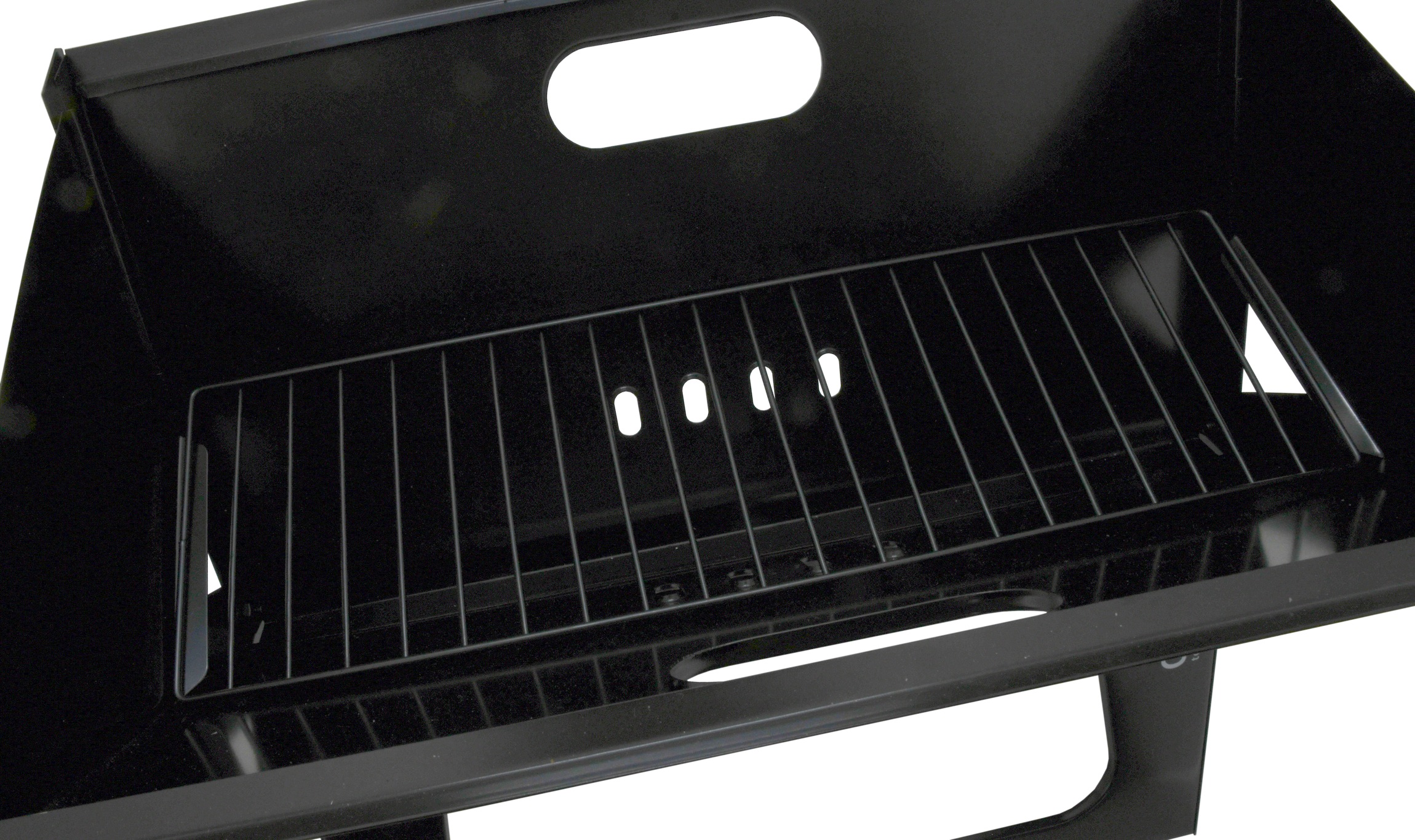 Pro tepelnou přípravu pochutin je gril opatřen ocelovým roštem a plochou 42,5 x 26 cm ve výšce 36,5 cm. Ventilace na čelní a zadní straně konstrukce zajistí plynulý přísun vzduchu.